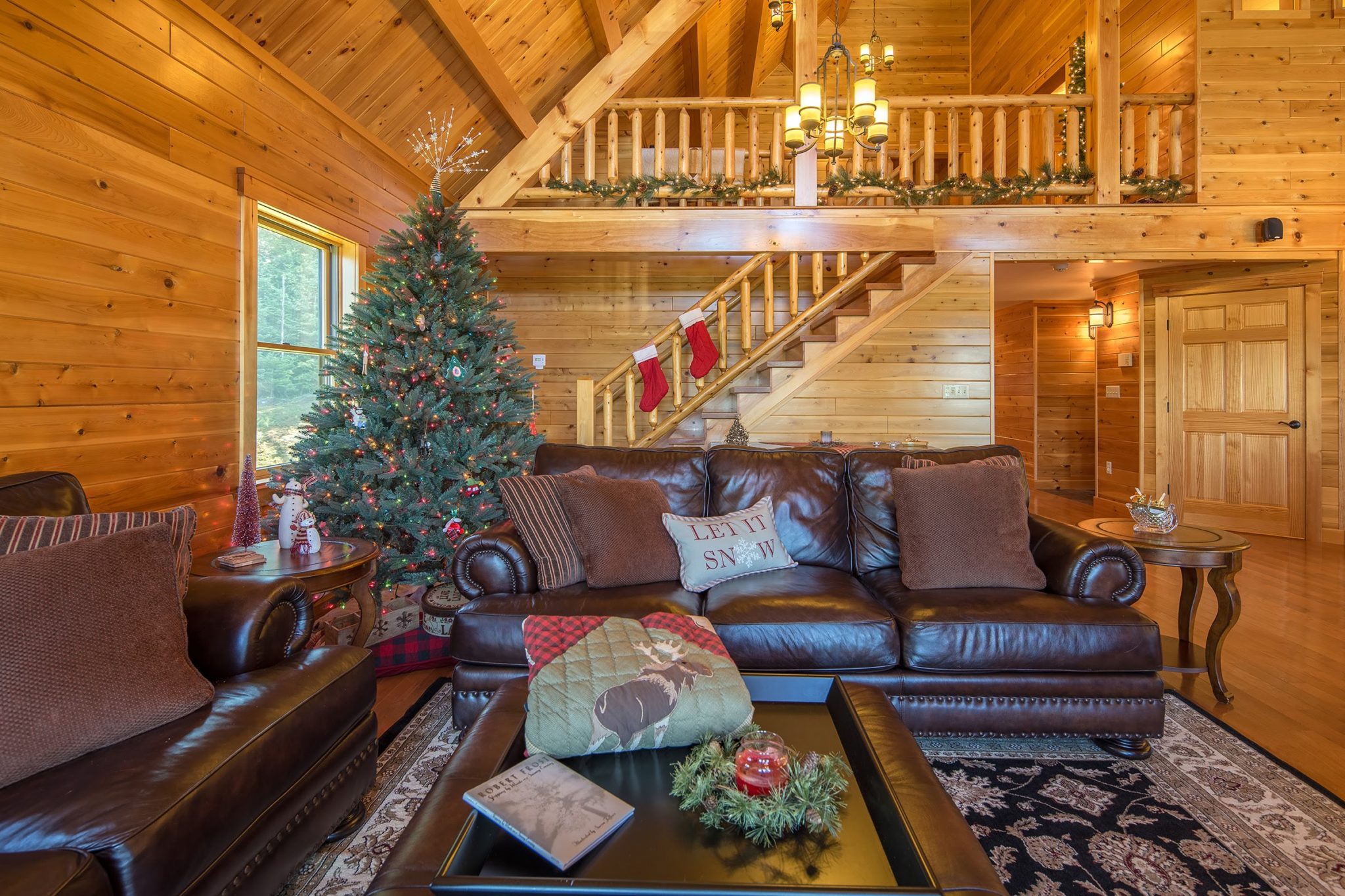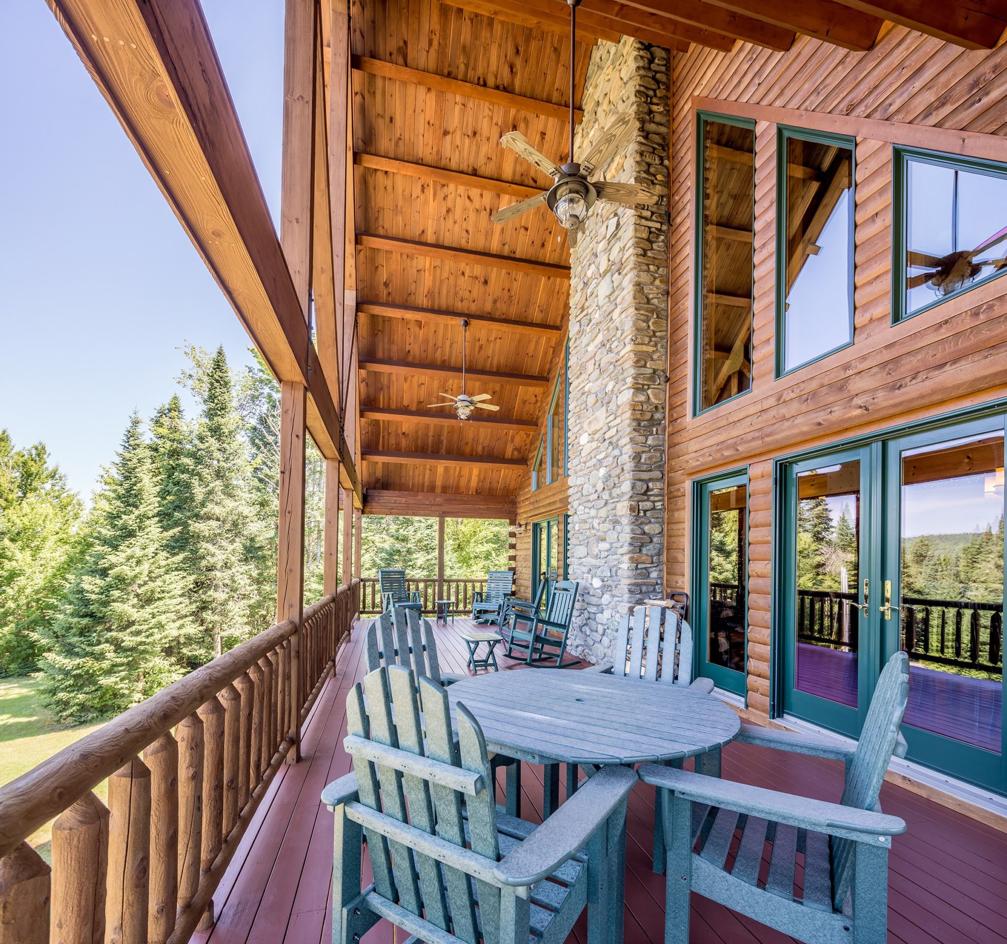 Situated at the top of a gentle slope, the Stewart’s Katahdin lodge commands stunning western panoramas. “The sunsets from the upper deck are so beautiful,” exclaims Shelley. “My dream was to have wraparound decks for entertaining and relaxing.” The 16- by 42–foot wide decks can comfortably accommodate groups of friends the Stewarts host throughout the winter season. The views don’t stop at the doors— an extensive wall of windows brings the outdoors into the great room.